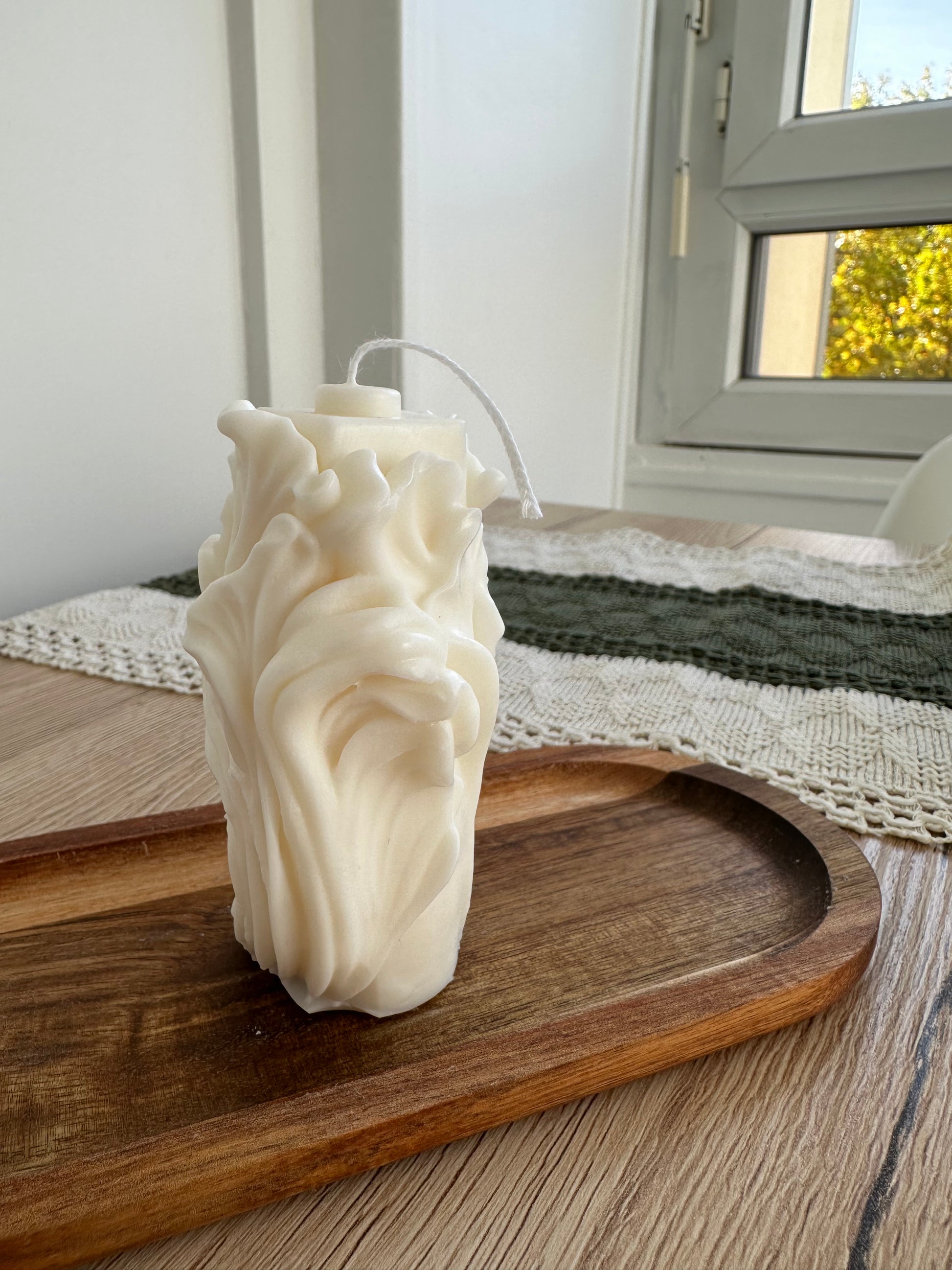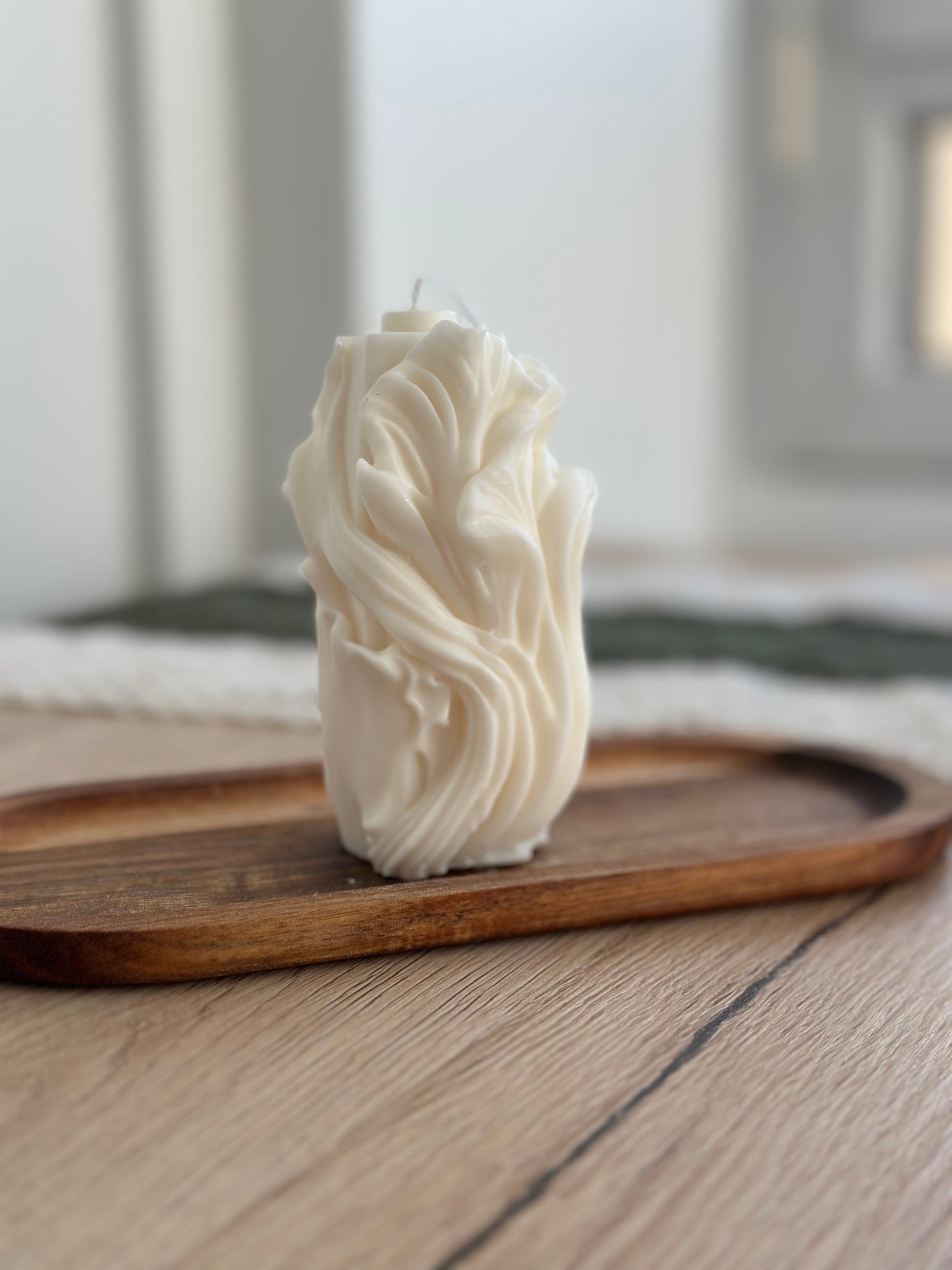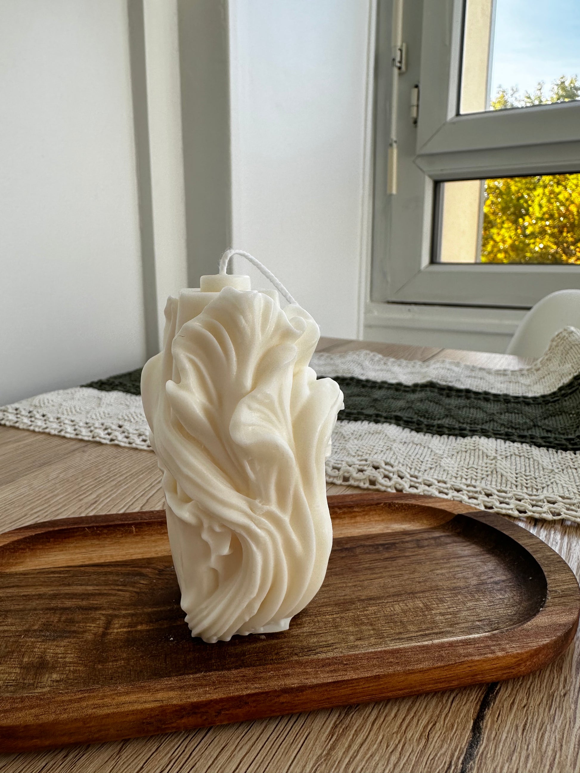 “Onda” s’inspire des mouvements doux et apaisants des vagues de la mer. Cette bougie sculpturale, réalisée en cire de colza, capture la fluidité et l’élégance de l’eau en créant une forme ondulante unique.