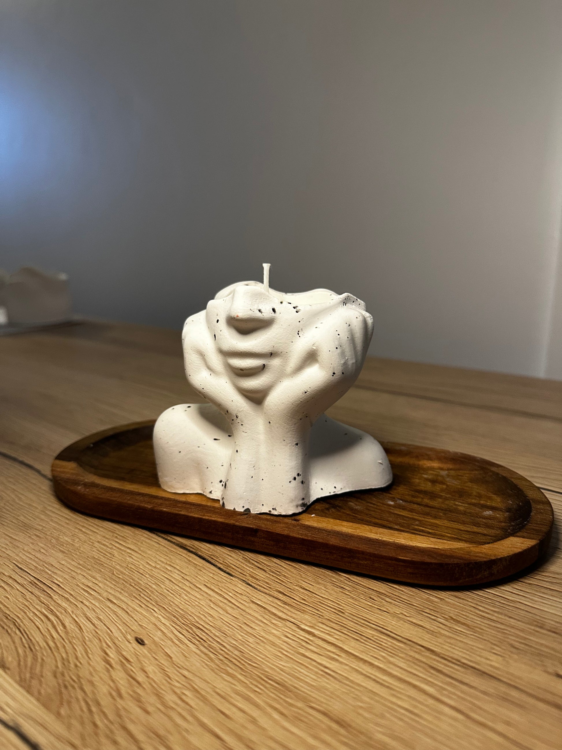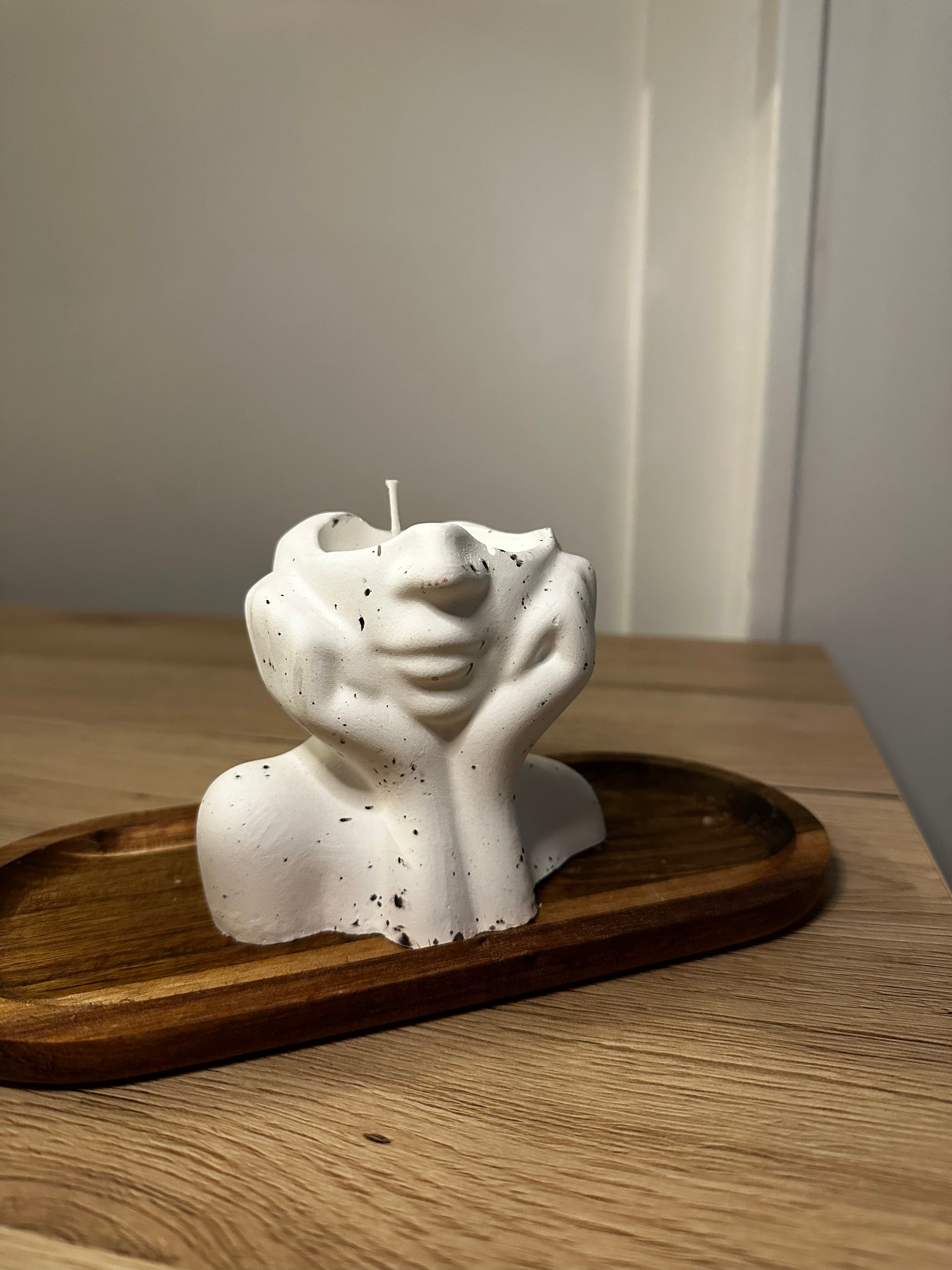 “Stéphanie” est une petite sculpture qui semble plongée dans ses pensées, la tête délicatement posée sur ses mains. Cette bougie incarne l’introspection et la sérénité, invitant à un moment de calme et de réflexion dans votre intérieur.